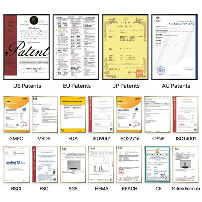 Our factory holds multiple international patents and global certifications, including CE, ISO9001, ISO22716, FDA, GMPC, and SGS. We ensure every product meets strict quality and safety standards for global beauty brands.